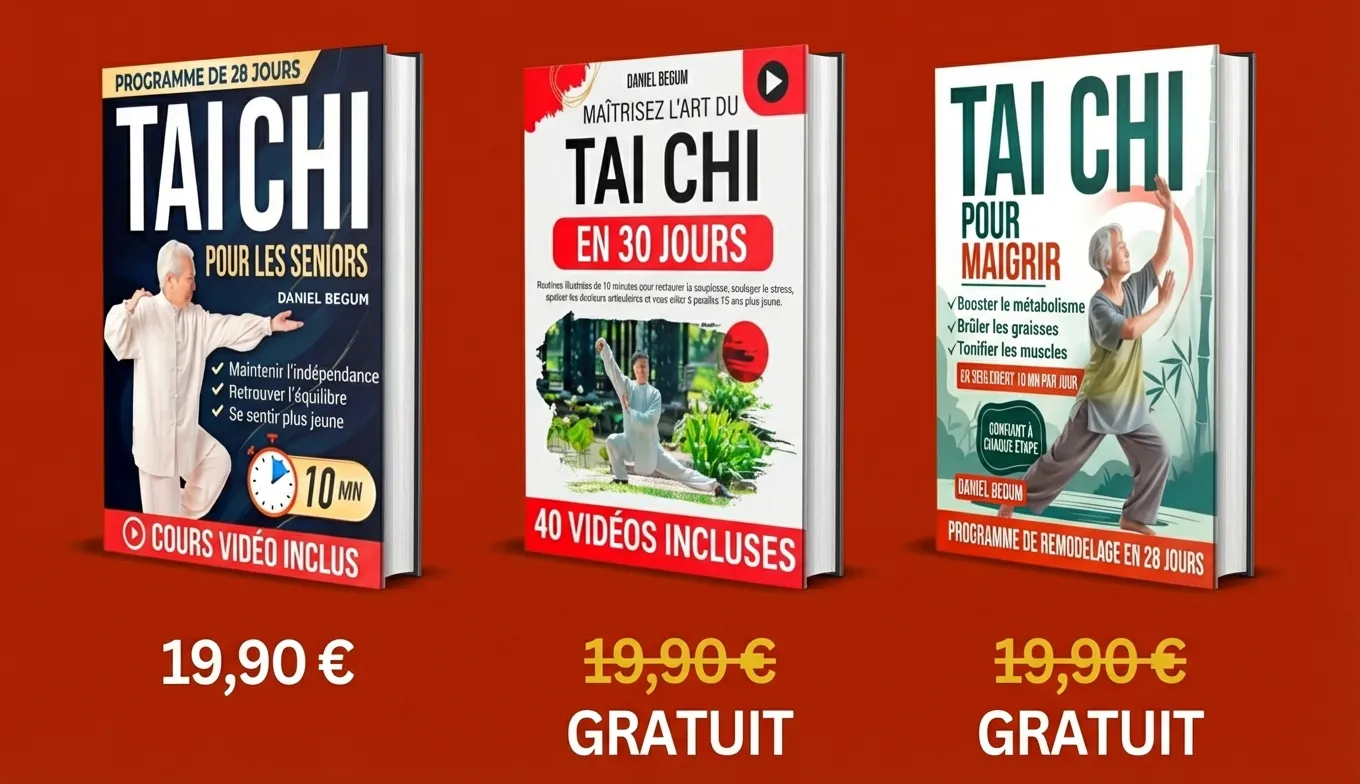 Cet ensemble vous offre tout ce dont vous avez besoin pour retrouver votre mobilité, renforcer votre corps et vous sentir plus jeune – le tout depuis la maison, sans équipement, sans douleur ni longues séances d’entraînement. Normalement au prix de 59,70 €, vous pouvez aujourd'hui obtenir l'intégralité du pack de 3 livres de Tai Chi pour seniors — PLUS le cours vidéo complet - pour 70 % DE RÉDUCTION.