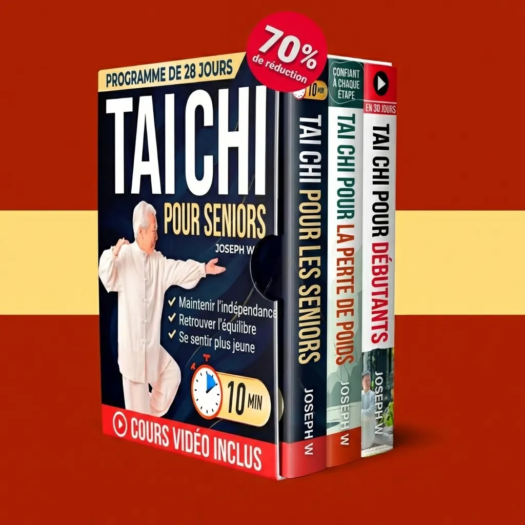 Cet ensemble vous offre tout ce dont vous avez besoin pour retrouver votre mobilité, renforcer votre corps et vous sentir plus jeune – le tout depuis la maison, sans équipement, sans douleur ni longues séances d’entraînement. Normalement au prix de 59,70 €, vous pouvez aujourd'hui obtenir l'intégralité du pack de 3 livres de Tai Chi pour seniors — PLUS le cours vidéo complet - pour 70 % DE RÉDUCTION.